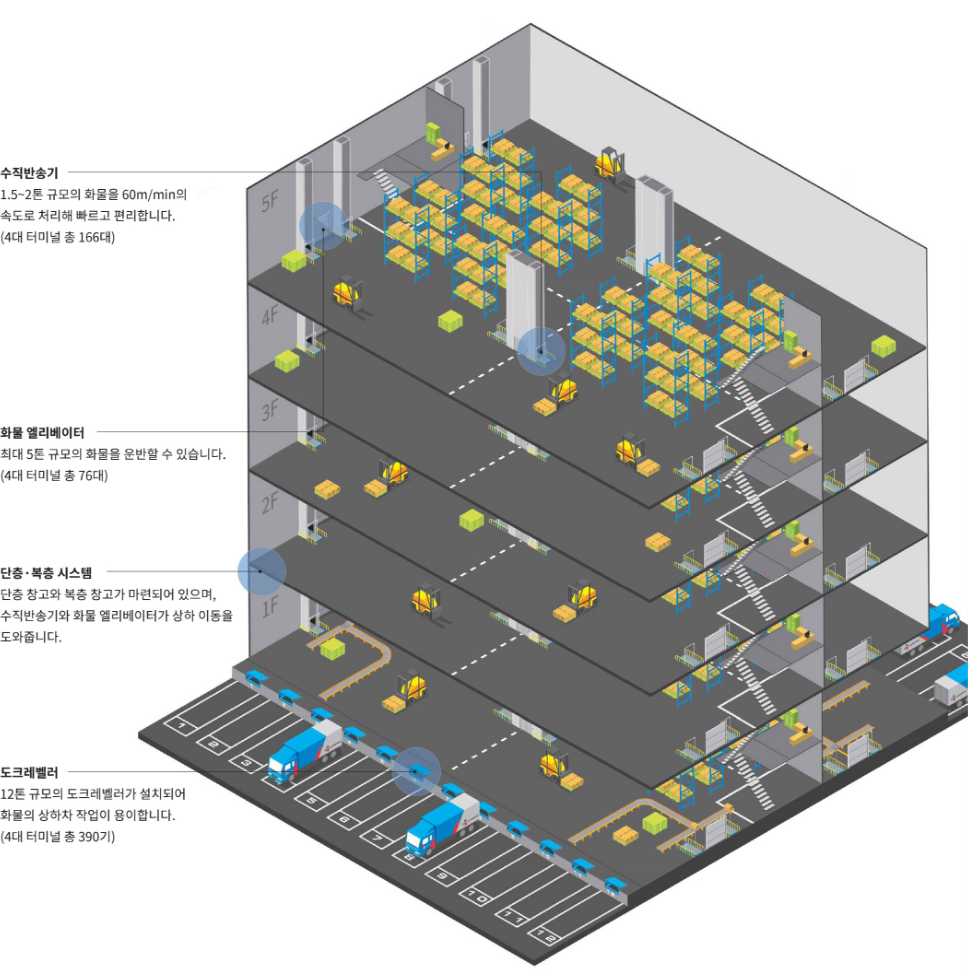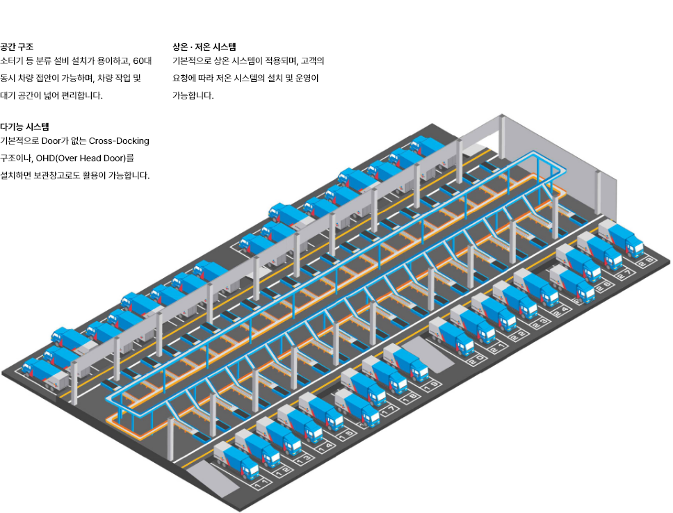 극대화한 물류창고로, 차량 60여 대의 동시접안 및 상·하역